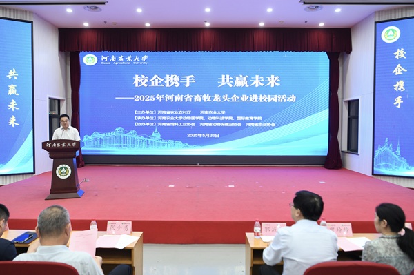 本网讯(通讯员 林智雅)5月26日,以“校企携手 共赢未来”为主题的2025年河南省畜牧龙头企业进校园活动在我校隆重举行。河南省农业农村厅总畜牧师张全勇、畜牧处处长王彦华、饲料兽药处处长胡赓,河南省动物保健品协会会长郑宝振、河南省饲料工业协会会长郑文革、河南省奶业协会秘书长陈华杰,我校副校长郭战伟、招生就业办公室副主任曾玲玲、动物医学院院长魏战勇、我院院长李明、国际教育学院院长梁兵,及普莱柯生物工程、河南亿万中元、河南牧翔生物等11家畜牧龙头企业嘉宾出席活动。活动由胡赓主持。我校三百余名师生到场交流。