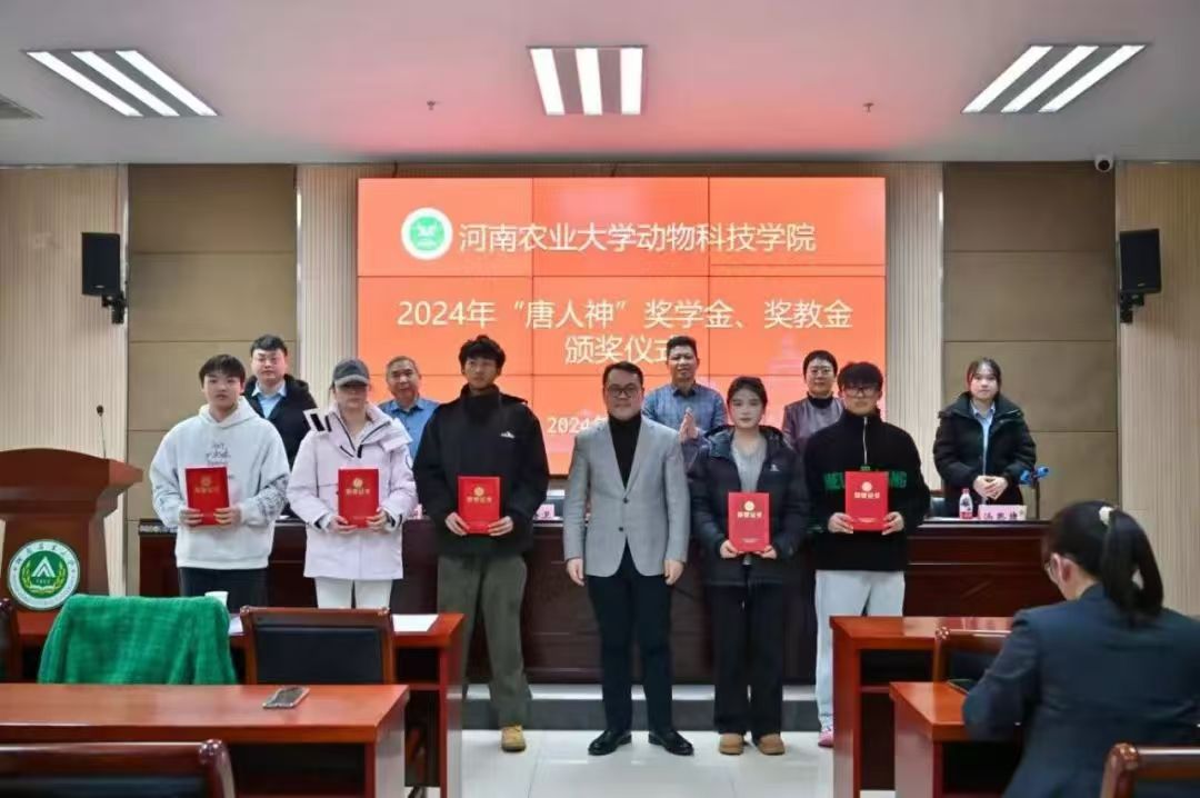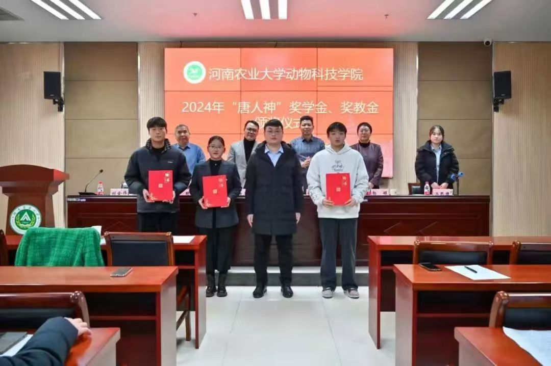胡明忠宣读《动物科技学院关于颁发2024年“唐人神”奖学金、奖教金的决定》,随后,企业领导赵海卫为获奖师生依次颁奖并合影留念。