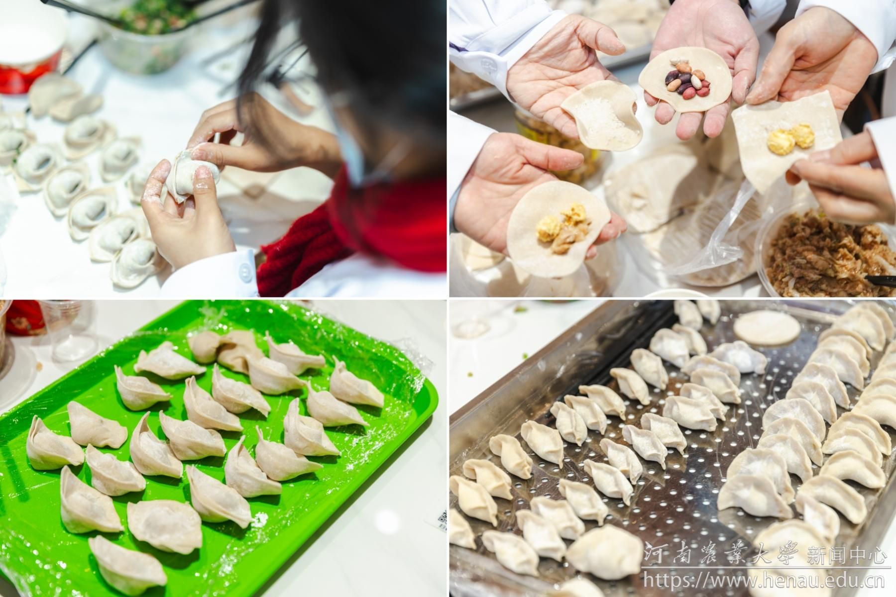 据悉,本次包饺子活动所用的“饺子皮”所用面粉是由农学院小麦分子育种创新团队选育的超强筋小麦新品种“豫农269”加工而成。该品种具有蛋白质、湿面筋含量高,湿面筋质量优,吸水率高,稳定时间长等特点,做成的食物具有弹性好,延展性好,口感筋道,耐煮等特点。“饺子馅”里的猪肉使用的是我校生猪遗传改良与种质资源创新团队与谊发牧业联合培育的谊发优质猪,羊肉为我国特有的地方绵羊品种——湖羊,由我校动物科学教学科研实践基地、河南帮德农业科技有限公司提供。水饺使用的蔬菜来自园艺学院和豫艺公司共同选育的香叶芥新品种——“香叶饺子菜”,该品种香叶芥含有特殊的清香味,味道鲜,品质优。