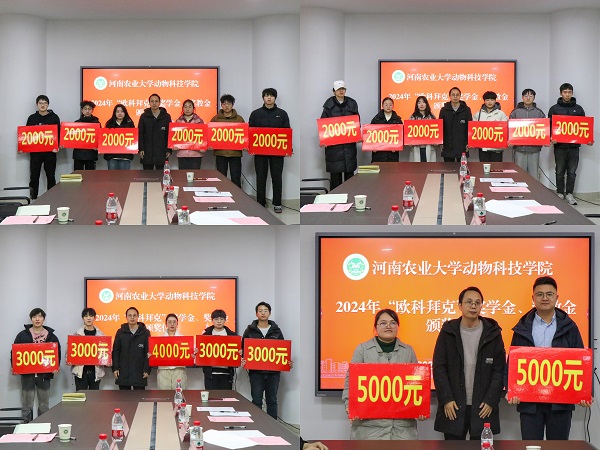 闫东宣读了《动物科技学院关于颁发2024年“欧科拜克”企业奖学金、奖教金的决定》。随后,企业领导杨小进为获奖师生颁奖,并合影留念。
