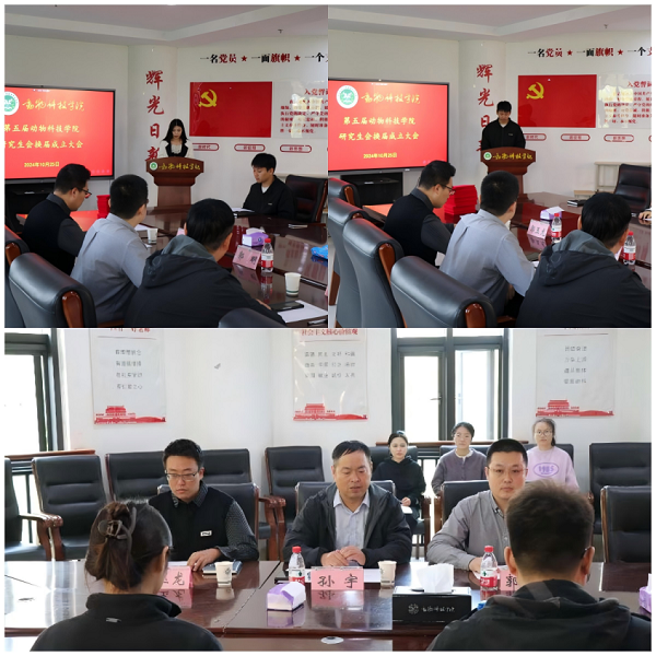 本网讯(通讯员 董冰涵 孙世钦)我院于10月25日在第一实验楼北330会议室举办第五届研究生会换届成立大会。动物科技学院副院长孙宇、动物科技学院教师郭玉龙、动物科技学院研究生辅导员郭明参加会议,会议由郭明主持,研究生会全体成员参加会议。