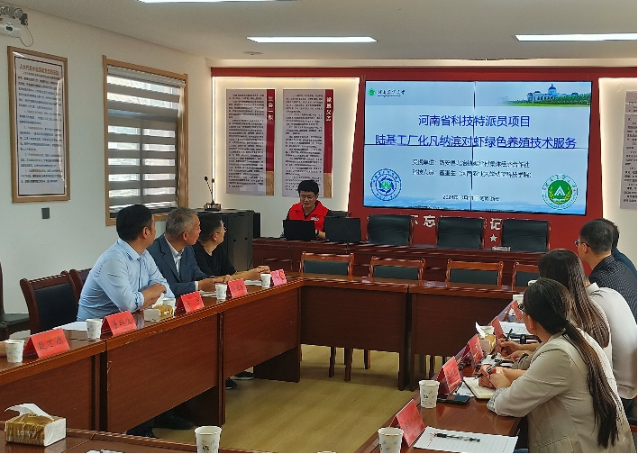 随后,河南农业大学动物科技学院孙宇副院长、董鹏生博士代表河南农业大学与新安县科技局、北冶镇政府进行三方座谈。郑利权局长对孙宇副院长、董鹏生博士一行表示热烈欢迎,并表示全力支持河南农业大学技术专家开展科技服务;北冶镇人大主席龚婷和碾坪村党支部书记靳如钦分别感谢河南农业大学专家送物资、送技术,期待“虾菜共生”项目在大家的共同努力下不断做大做强。三方就新形势下合作社的未来发展方向、“鱼虾共生“模式、休闲渔业与文旅有机结合等方面进行了会谈。
