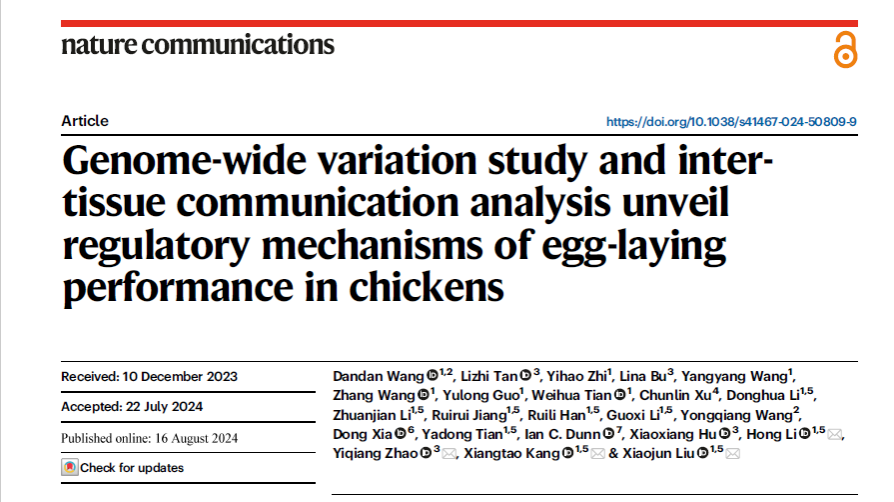 本网讯(通讯员 李红),近日,河南农业大学康相涛院士团队在地方鸡产蛋性状调控机制研究方面取得突破性进展。于2024年8月16日在国际著名期刊《Nature Communications》 (IF=14.7)在线发表了题为“Genome-wide variation study and inter-tissue communication analysis unveil regulatory mechanisms of egg-laying performance in chickens”的研究论文。首次系统揭示了外周组织关键内分泌因子通过组织间通讯的方式调控鸡产蛋量性状的新机制,为鸡产蛋量性状的调控机制解析提供了新见解。