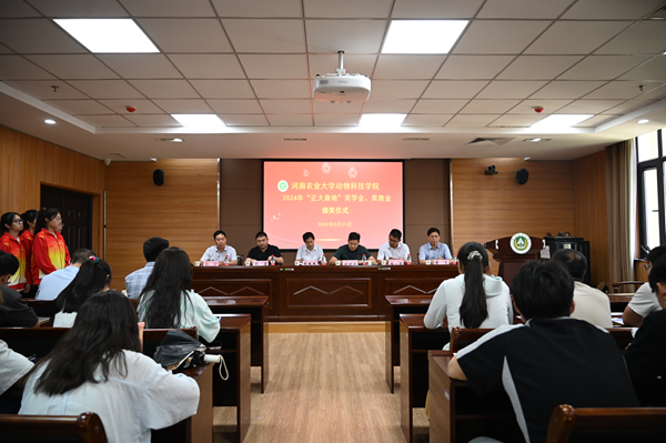 胡明忠宣读了《动物科技学院关于颁发2024年“正大康地”奖学金、奖教金的决定》。随后,企业领导赵威威依次为获奖师生颁奖并合影留念。