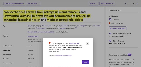 本网讯(通讯员 饶志勇)近日,根据科睿唯安ESI(Essential Science Indicators)公布的最新数据,动物科技学院王志祥教授以通讯作者在动物科学领域知名期刊Poultry Science上发表的研究论文《Polysaccharides derived from Astragalus membranaceus and Glycyrrhiza uralensis improve growth performance of broilers by enhancing intestinal health and modulating gut microbiota 》入选ESI高被引论文(Highly Cited Paper)。该项研究发现黄芪多糖和甘草多糖能够通过改善肠道健康和调节肠道菌群进而提高肉鸡生产性能,本研究为黄芪和甘草这两种重要药用植物在畜禽健康养殖上的开发利用提供了重要科学依据,该论文发表一年以来,累计他引次数达到23次。