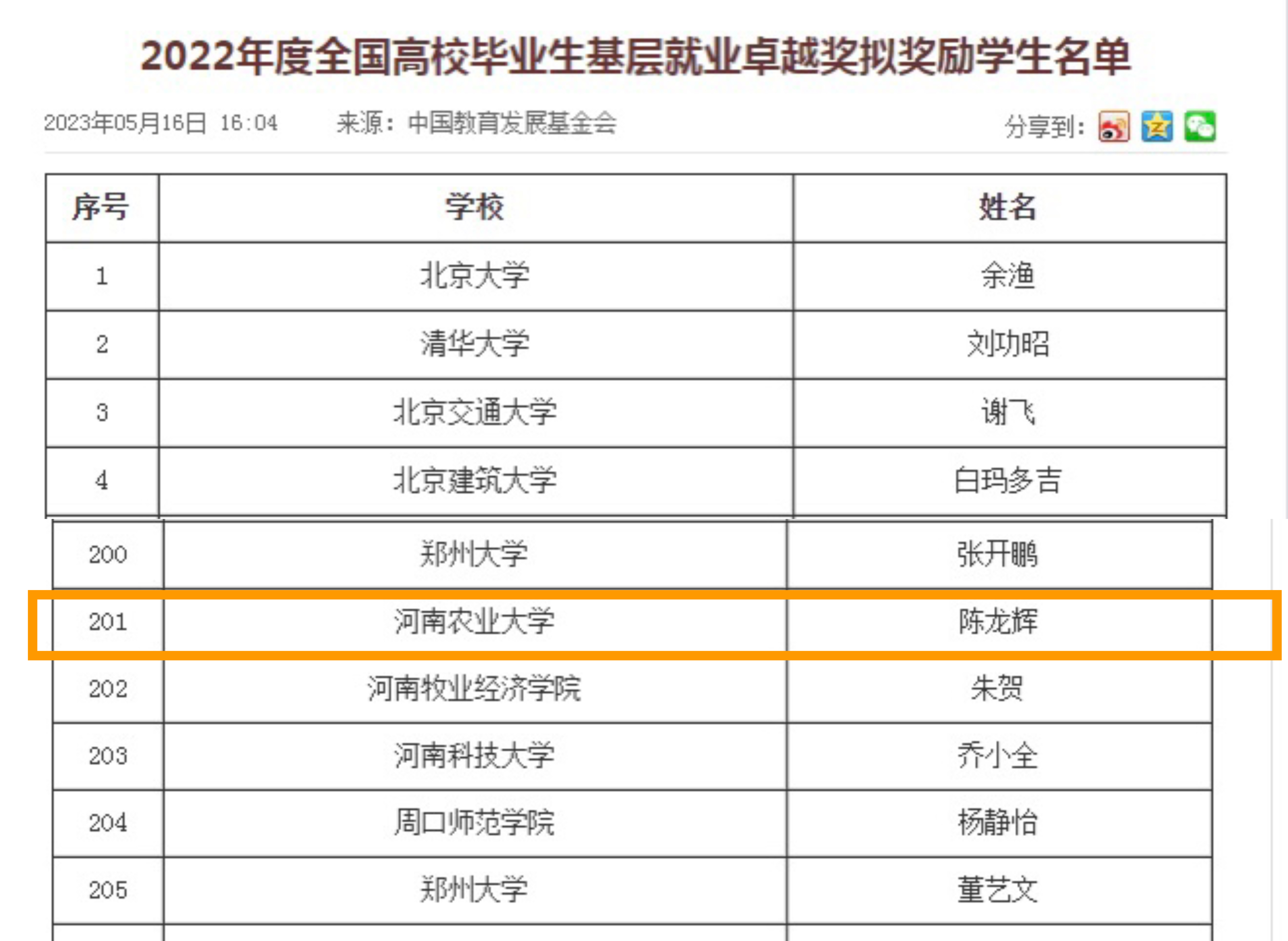 本网讯(通讯员 赵姝灿)近日,中国教育发展基金会公布了2022年度“全国高校毕业生基层就业卓越奖”名单,我院2016届优秀毕业生陈龙辉光荣上榜。