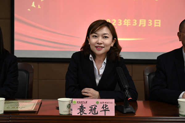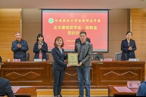 袁冠华作为企业代表讲话,她表示,前期集团与学院签订了产学研合作基地,建立了校企合作良好的开端;此次签订奖学金、奖教金捐赠协议,将进一步打造更广范围、更深程度、更高水平的校企创新联合体;并真心期望正大康地集团能够成为河南农业大学人才输出基地、成果转化基地、教学实践基地以及实验试验基地,希望校企合作生生不息、步步登高。