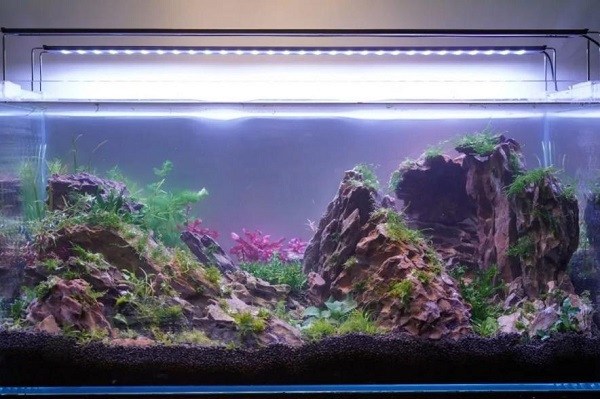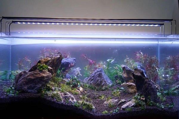 此景骨架是以月亮的圆弧为原型,左右两边均以圆弧形状的石头作为主要骨架,前大后小,左高右低,透露出大自然的自然之美,和谐之美。中间则以层叠的石头作为修饰,增加景观的深度。在水草的选择与种植上,前景草和中景草的比例较大,原因在于前景草和中景草更能和我们的景观结合在一起,能更好地体现我们的主旨。水草与青龙石相结合,生活在一起,青指的是青草也是水草,石当然是青龙石,水草与青龙石共生在一起,这何尝不是一种大自然的生态美。