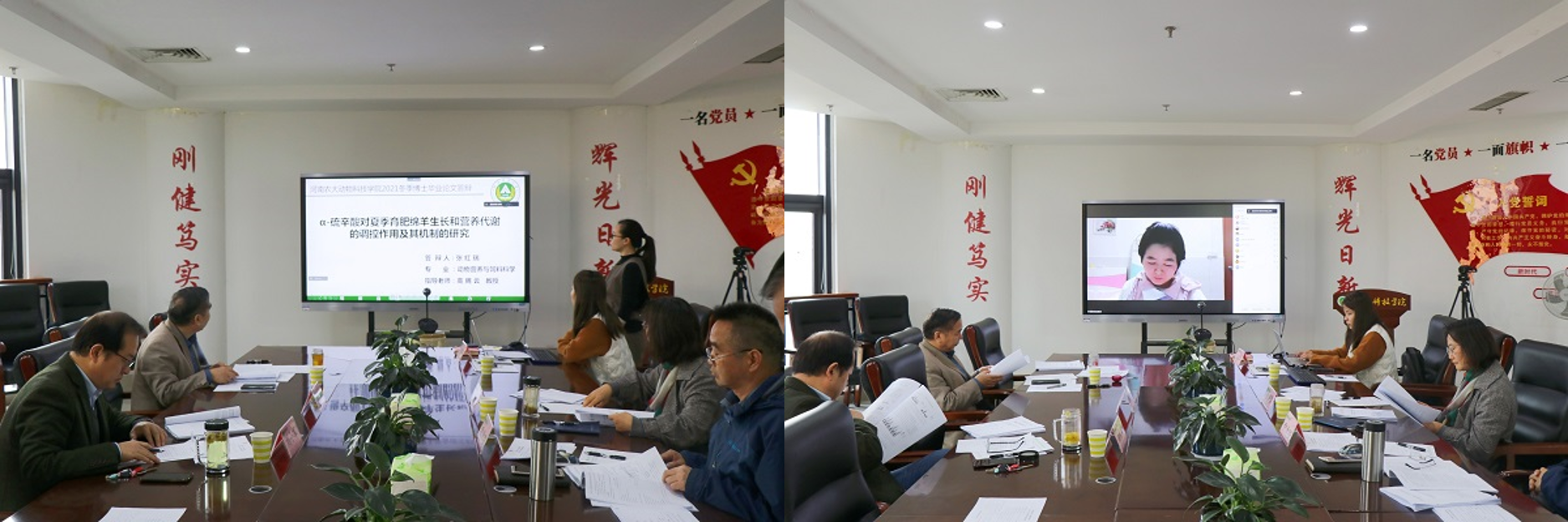 本次论文答辩采用的是线上和线下相结合的形式。答辩会严格遵守河南农业大学研究生论文答辩的要求和程序,主要分为导师介绍答辩人个人情况、答辩人PPT汇报、参会老师提问与答辩人回答三个环节。我院张红瑞博士、刘丹丹硕士等分别对“α-硫辛酸对夏季育肥绵羊生长和营养代谢的调控作用及其机制的研究”、“AdipoQ对蛋鸡下丘脑-垂体-卵巢轴生殖激素表达及卵泡生长发育的影响”等3篇学位论文从研究意义、研究内容、研究方法和研究结论等方面进行报告,答辩委员会委员针对答辩人陈述对其论文进行评议,并提出针对性问题及意见。答辩人员认真记录并表示会认真听取专家的宝贵建议和意见,对论文进行进一步修改完善。经答辩委员会商议和无记名投票,一致同意张红瑞博士和刘丹丹硕士的论文通过答辩。整个答辩过程公开透明,严谨公正,流程规范。