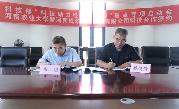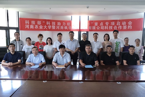 本网讯(通讯员 李新建)为进一步深化产教融合、校企合作,切实提高科研水平和人才培养质量,8月26日上午,动物科技学院在第一实验楼330会议室举行科技部“科技助力经济2020”重点专项启动会暨动物科技学院与河南枫华种业股份有限公司科技项目签约仪式。河南枫华种业股份有限公司总裁魏俊清、总经理李韦均,校科技处副处长田志强,院党委书记贾磊、院长李明出席仪式,养猪创新团队师生代表参加仪式。仪式由课题主持人、动物生产系党支部书记李新建主持。