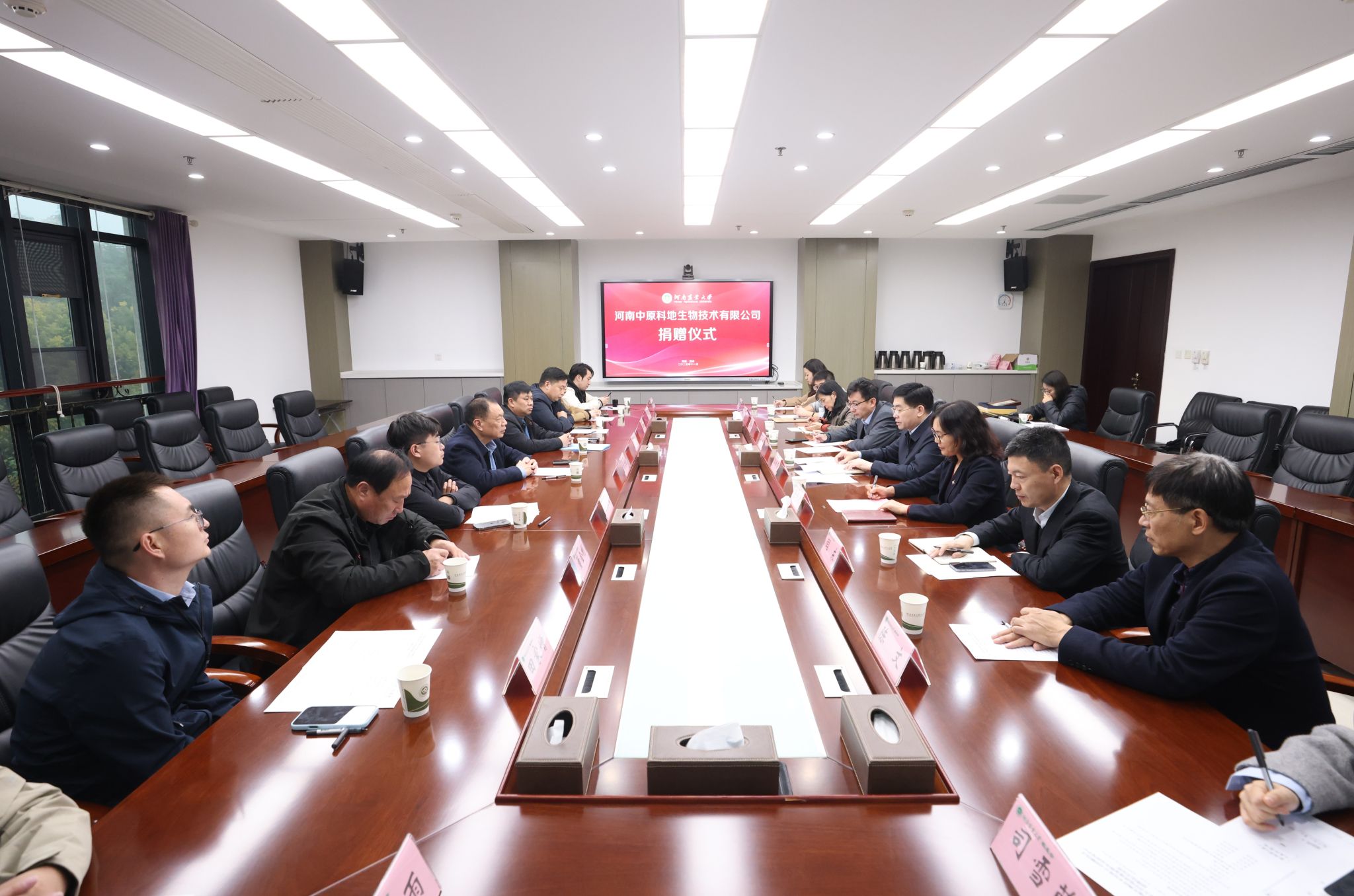 郭战伟代表学校对原文浩一行表示欢迎,并对河南中原科地生物技术有限公司的捐赠表示感谢。他简要介绍了学校基本情况和近几年学校发展取得的成绩。他表示,为实现一流大学与一流企业的双向奔赴、融合创新,学校确立了“名校名企融合创新战略”,将校企合作作为推动教育链、人才链与产业链、创新链深度融合的核心路径,希望双方以此次捐赠为契机,依托“河南农业大学中原科地宠物食品研发中心”平台,不断开创“优势互补、资源共享、协同创新、共同发展”新局面。