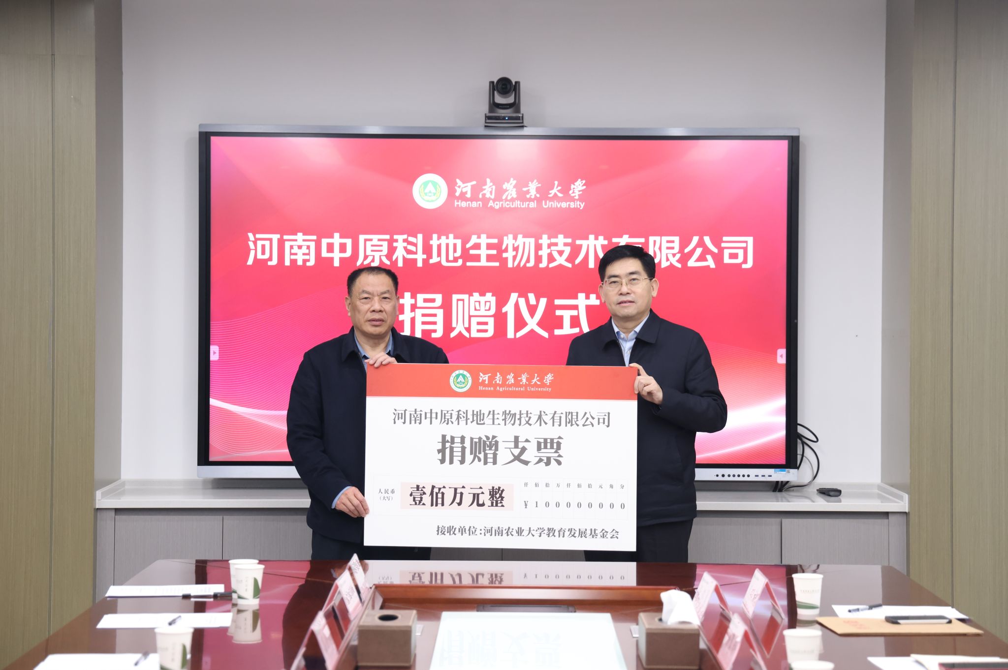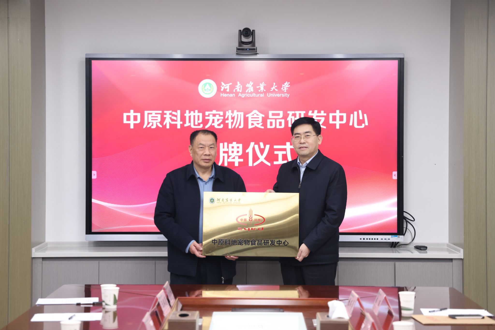 副校长郭战伟代表学校接受捐赠,并向原文浩颁发捐赠证书、纪念校徽,为“河南农业大学中原科地宠物食品研发中心”授牌。