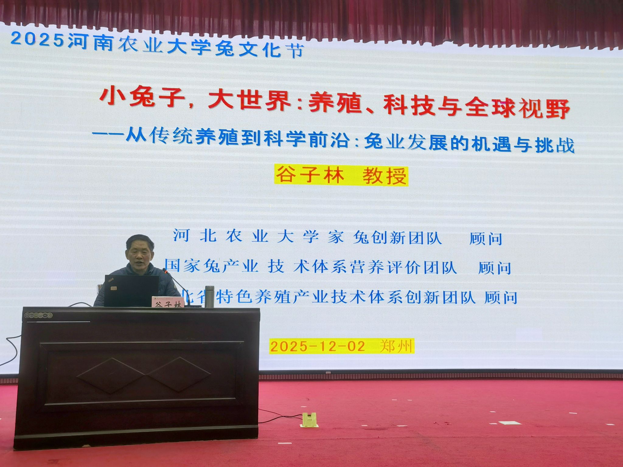 (通讯员 许会芬)12月2日下午,我院在龙子湖校区繁塔楼大教室1举办第208期“日新论坛”学术交流活动。河北农业大学谷子林教授受邀为我院师生作题为《小兔子,大世界:养殖、科技与全球视野——从传统养殖到科学前沿:兔业发展的机遇与挑战》的报告,报告由我院李明教授主持,我院青年教师刘伯帅、河南科技大学张自强教授、济源市阳光兔业科技有限公司总裁段天奎等企业代表及动物生产类专业本科生共200余人参加了本次报告。