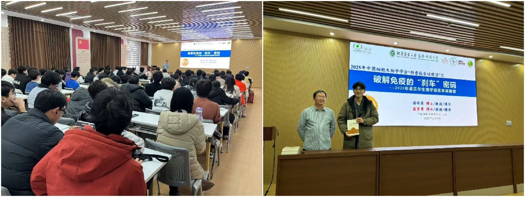 蓝教授首先带领大家回顾了诺贝尔奖的百年发展历程。随后梳理了10年间诺贝尔生理学或医学奖的重磅成果。最后解读了2025年诺贝尔生理学或医学奖的获奖成果,以“外周免疫耐受机制的突破性发现”为逻辑主线,层层深入解析免疫系统的精密调控网络。蓝教授重点讲述了调节性T细胞(Treg)从偶然发现到精准定位的科研历程,详细阐释了其核心调控基因FOXP3的表达机制与功能特性。报告最后还设置了趣味问答环节,同学们积极参与,蓝老师为回答正确的同学赠送了科普读物,以示鼓励。