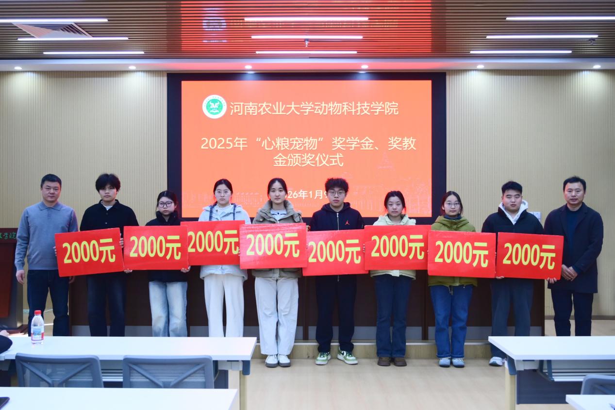 闫东宣读《动物科技学院关于颁发2025年“心粮宠物”企业奖学金、奖教金的决定》,企业领导依次为获奖师生颁奖并合影留念。