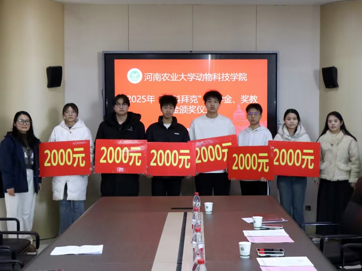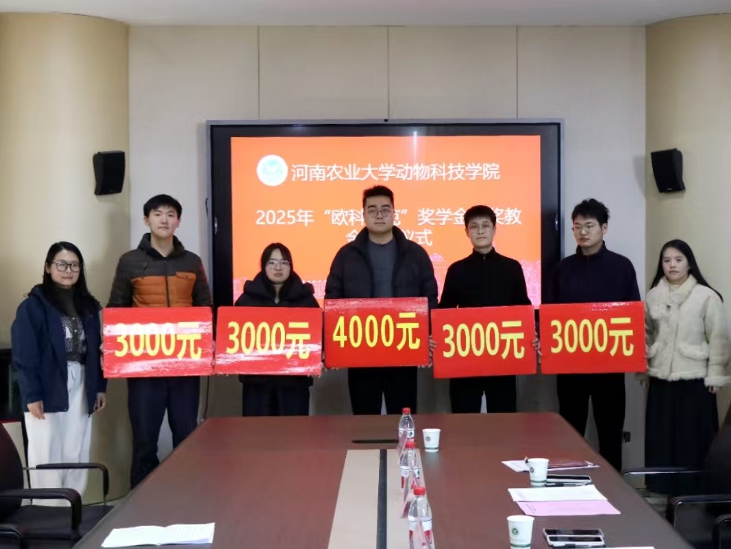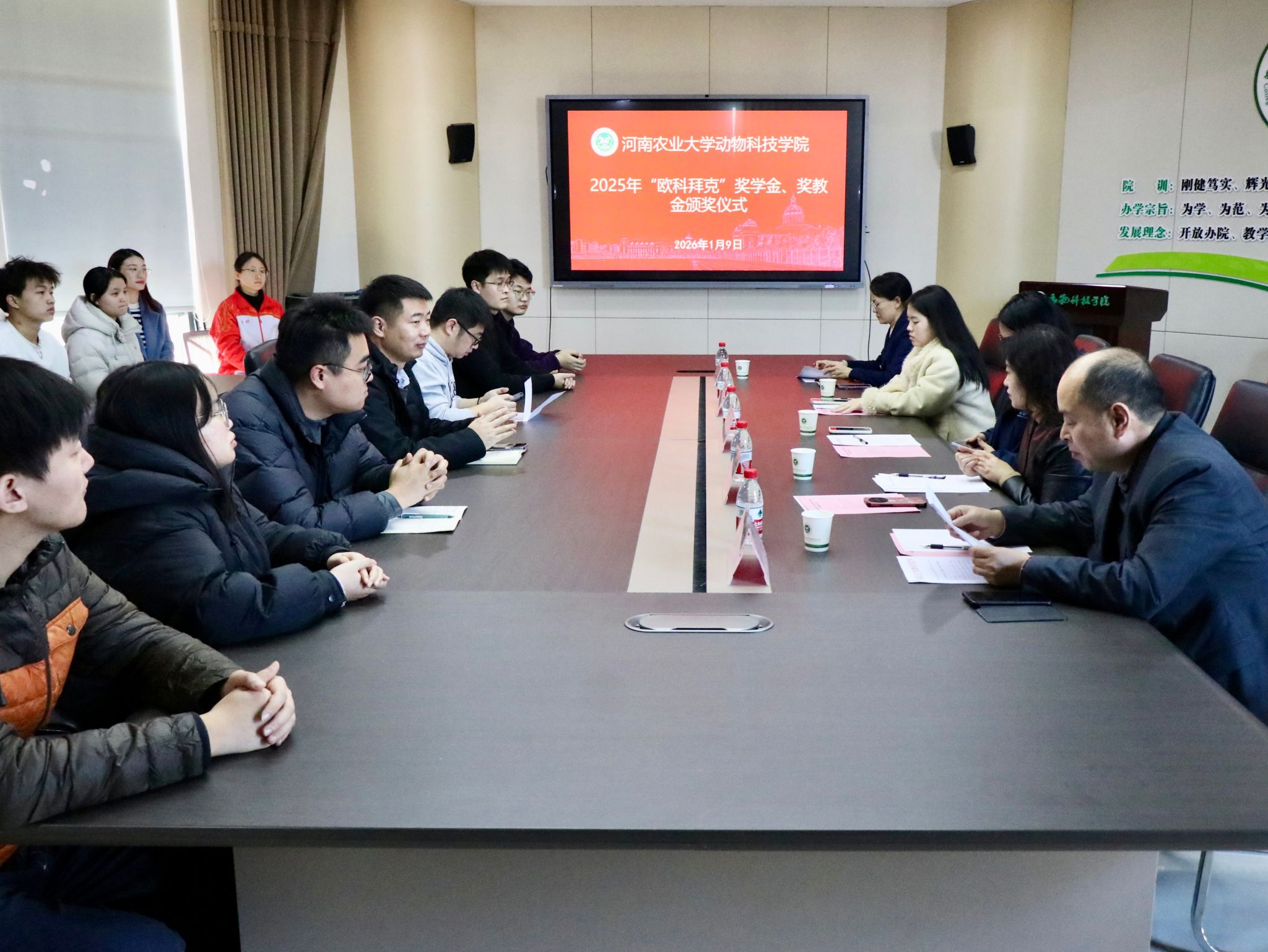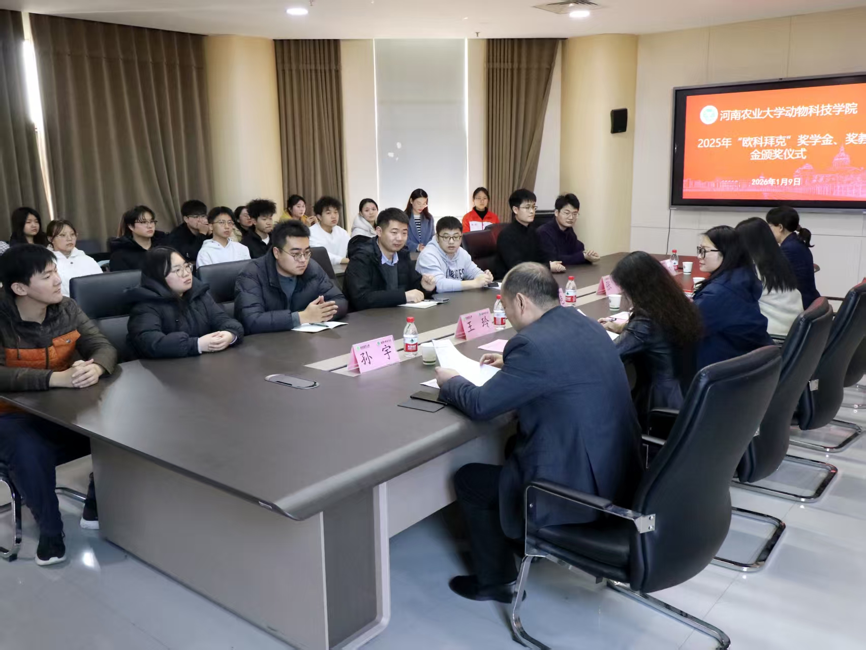 本网讯(通讯员 朱琳 图片 孙玉艳)1月9日下午,我院于龙子湖校区第一实验楼南501会议室举办2025年“欧科拜克”企业奖学金、奖教金颁奖仪式。欧科拜克生物技术股份有限公司综合部经理金艳艳、企宣部经理张璇、我院党委副书记王玲、副院长孙宇、动物营养与饲料科学系主任常娟出席颁奖仪式,我院获奖师生及部分学生代表参加会议,会议由孙宇主持。