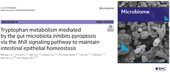 (通讯员 刘孟琦)近日,我院史莹华教授团队在国际微生物学著名期刊《Microbiome》(IF=12.7, IF5=16.6)在线发表了研究论文,题目为“Tryptophan metabolism mediated by the gut microbiota inhibits pyroptosis via the AhR signaling pathway to maintain intestinal epithelial homeostasis”。该研究揭示了肠道微生物介导的色氨酸代谢通过AhR信号通路抑制细胞焦亡维持仔猪肠道上皮稳态的机制,为开发新型肠道健康调控策略提供了新视角,为仔猪肠道炎型疾病的防治提供了新思路。