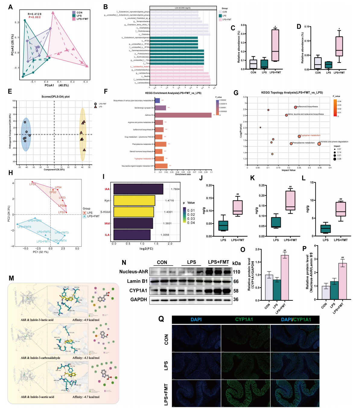 图1 FMT重塑LPS攻毒仔猪肠道菌群和色氨酸代谢,并激活AhR信号通路