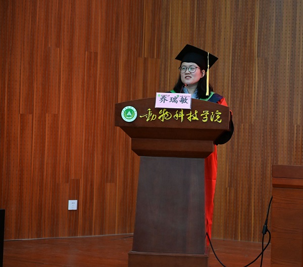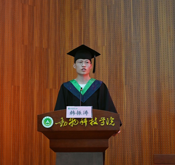 优秀毕业生代表韩振涛从学生视角回顾了在动科生活的点点滴滴,充满对母校的热爱和不舍,他表示在求学生涯里,一路有过“一山放过一山拦”的困难挫折,也有过“艰难困苦有时尽,直挂云帆济沧海”的豪迈情怀,但是动科寄予的丰厚滋养让我们“眼中有光,脚下有力,风雨何惧”,未来定不负母校期望,用最优异的成绩、最无限的激情去回报社会、报效祖国、把青春播撒在民族复兴的征程上。