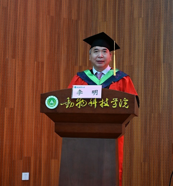 院长李明讲话,他祝贺学院76名本科生、49名研究生毕业快乐,同时为大家送上三句毕业赠言,一是青春正好,做终身学习筑牢立身之本的“小学生”,在下一个百廿历程中重新出发,从母校文化基因中汲取精神滋养,行稳致远;二是打开格局,做奋力担当不愧青春之我的“筑梦者”,勇于担当、敏于求知、勤于调研、善于实践,肩负起伟大时代赋予的光荣使命;三是摆正心态,做明辨是非把稳思想之舵的“追梦人”,离开校园,踏入社会,面临各种诱惑与试探时,能依旧内心火热,坚定向前。他援引习近平总书记在纪念共青团成立100周年大会上对青年人的殷切希望,寄语毕业生们:勇做新时代的弄潮儿,自觉听从党和人民召唤,胸怀“国之大者”,担当使命任务,到新时代新天地中去施展抱负、建功立业,争当伟大理想的追梦人,争做伟大事业的生力军,让青春在祖国和人民最需要的地方绽放绚丽之花。