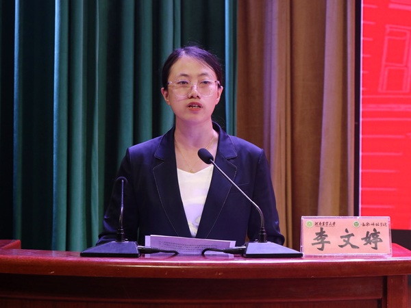 教师代表、硕士生导师李文婷教授在开学典礼祝贺新生,她表示大学里充满“自我发现”的机会:“独立思考、敢于质疑”的机会;“终身学习、坚守梦想”的机会;“实践创新、知行合一”的机会。她强调新生在大学四年里应该牢牢把握住机遇,练就真本领,涵养大格局。