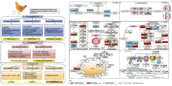 本研究首次提供了蛋鸡产蛋前和产蛋高峰期肝脏蛋白质组和乙酰蛋白质组的完整图谱。与产蛋前相比,产蛋高峰期蛋鸡中上调的蛋白主要与脂质和蛋白质的生物合成有关,下调的蛋白主要与丙酮酸代谢有关,能够抑制糖异生和乳酸合成。显著的乙酰化蛋白主要作用于过氧化物酶体中多不饱和脂肪酸氧化的激活,而显著的去乙酰化蛋白主要用于提高线粒体中、短脂肪酸氧化和氧化磷酸化。大多数参与糖异生、脂质转运和解毒的蛋白质都受到蛋白表达和乙酰化的影响。上述各方面共同促进了蛋鸡肝脏脂质代谢,以适应产蛋前至产蛋高峰期的生理变化。本研究结果为蛋白质和蛋白质乙酰化在蛋鸡肝脏代谢中的作用提供了新的认识。