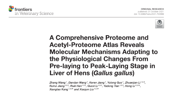 本网讯(通讯员 王章)日前,我院家禽研究团队对产蛋前和产蛋高峰期母鸡的肝脏蛋白质组和乙酰蛋白质组进行了比较,揭示了通过激活脂肪酸氧化和丙酮酸代谢产生乙酰辅酶A替代源以满足蛋鸡肝脏能量需求和脂肪合成的新机制。大多数参与糖异生、脂质转运和解毒的蛋白质都受到蛋白表达和乙酰化的影响。10月21日,该研究成果在期刊Frontiers in Veterinary Science(IF=3.412),以Article形式在线发表。