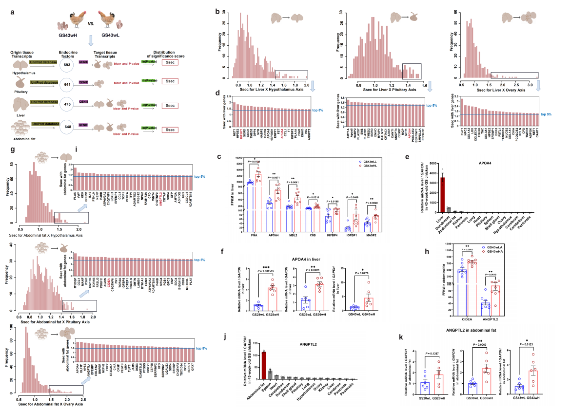 针对地方鸡肉、蛋品质优异但产蛋性能偏低的问题,团队综合运用GWAS、比较基因组、WGCNA及QENIE等分析方法,从组织间通讯角度进行了系统研究,首先对900只产蛋记录完整的14世代固始鸡进行基因组重测序,通过基于SNP、单倍型和CCA的三种GWAS分析方法,结合产蛋表型明显差异的红色原鸡、地方鸡和高产蛋鸡三类群体的比较基因组分析,鉴定受到强选择的产蛋量相关的关键候选基因(图1);其次整合高、低产蛋量固始鸡下丘脑、垂体、卵巢、肝脏和腹脂5个组织的转录组数据,结合WGCNA分析和差异分析,分别挖掘出正向和负向影响产蛋表型的核心候选基因;然后进一步通过定量内分泌网络互作估计分析,鉴定出影响鸡产蛋量的下丘脑、肝脏和腹脂特异性关键内分泌因子分别为27个,15个和19个(图2);最后通过活体组织特异性过表达试验,进一步证明了肝脏特异性内分泌因子APOA4和腹脂特异性内分泌因子ANGPTL2通过组织间通讯靶向HPO轴调控鸡产蛋量的作用机理,揭示了鸡产蛋量性状多组织协同调控的新机制(图3)。该研究为更深入理解包括家禽产蛋量性状在内的复杂性状调控分子机制提供了新思路,为更准确地鉴定与产蛋量性状相关的致因变异提供了宝贵的资源库。