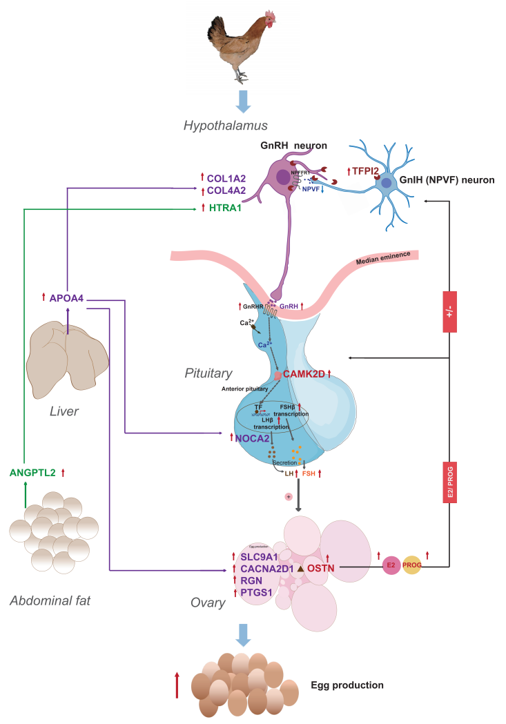 图3 多组织关键内分泌因子通过HPO轴协同调控鸡产蛋量示意图