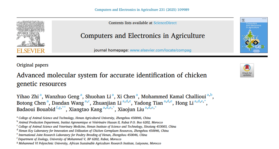 本网讯(通讯员 职毅豪,李红)近日,我院康相涛院士团队刘小军课题组在国际著名学术期刊《Computers and Electronics in Agriculture》在线发表了题为 “Advanced molecular system for accurate identification of chicken genetic resources 的研究论文。该研究成功开发了一种高效、准确的鸡种质资源分子鉴定系统,为鸡遗传资源的保护和利用提供了有力的技术支持。