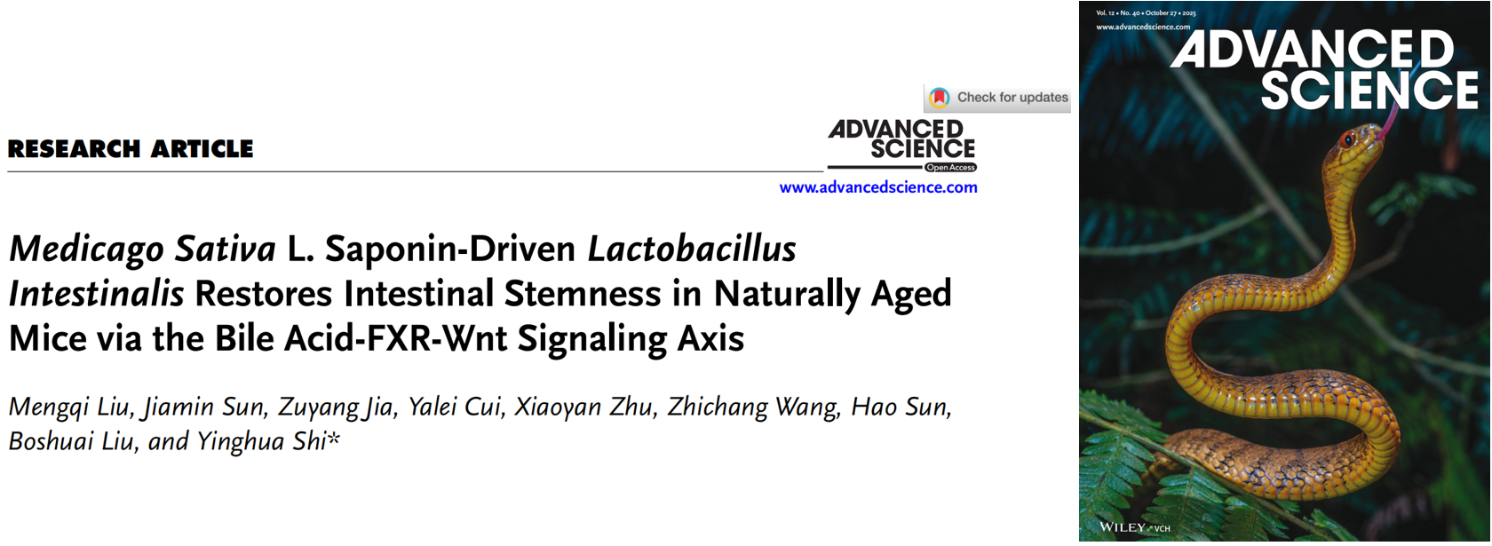 近日,我校动物科技学院史莹华教授团队在中科院一区期刊Advanced ScienceIF=14.1IF5=15.6)在线发表了研究论文,题目为Medicago Sativa L. Saponin-Driven Lactobacillus Intestinalis Restores Intestinal Stemness in Naturally Aged Mice via the Bile Acid-FXR-Wnt Signaling Axis。该研究揭示了苜蓿皂苷通过特定肠道菌及其代谢物调控动物肠道干性缓解炎症延缓衰老的机制,为利用饲草功能性提取物保护肠道健康提供了新的视角为饲草深加工产品的开发利用提供了新思路。