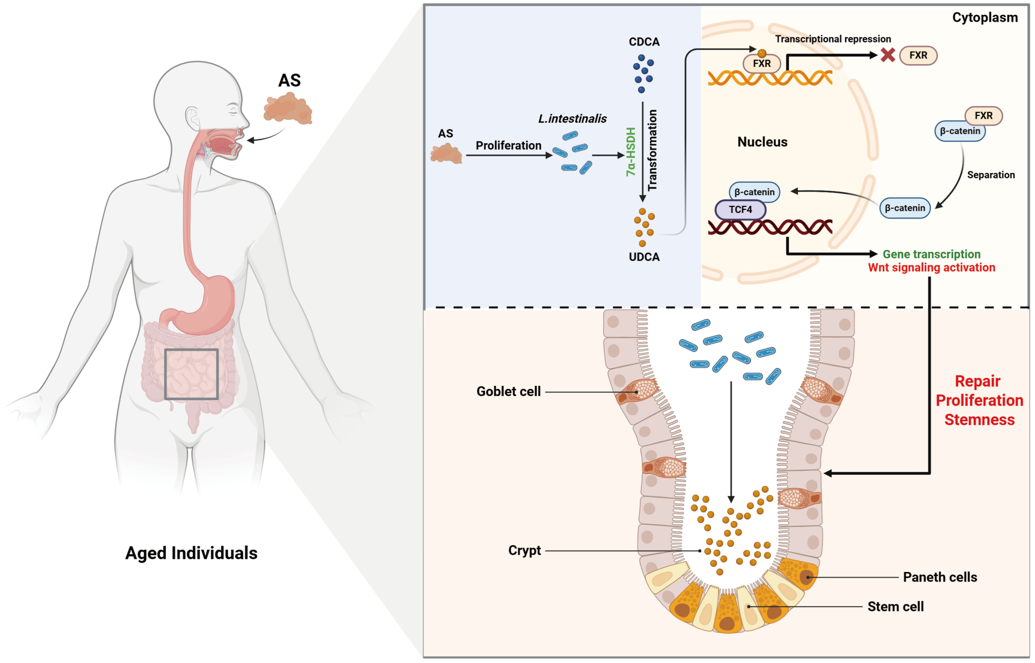 研究发现AS主要通过调控肠道微生物发挥作用。AS能够调节自然衰老小鼠的肠道微生物组成,并促进Lactobacillus intestinalis的增殖,从而增强肠道干性。进一步研究发现Lactobacillus intestinalis调控胆汁酸代谢产生的熊去氧胆酸(Ursodeoxycholic acid, UDCA)是AS影响肠道干性的关键介质。UDCA能够抑制肠上皮细胞中的FXR信号,FXR抑制增强了β-cateninTCF4的结合,从而激活Wnt信号通路及其靶基因的转录。这一系列变化增强了肠道干细胞的修复、增殖和干性,促进肠道上皮的稳态和再生。
