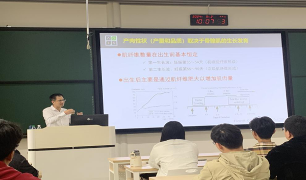 唐中林研究员的报告深入浅出,从猪骨骼肌生长发育的转录组图谱入手探讨了DNA甲基化、m6A甲基化、circRNA、LncRNA、miRNA以及RNA编辑等多个层面对猪骨骼肌生长发育的调控机制。详细介绍了其团队在猪产肉性状遗传和表观遗传调控领域取得的突破性成果。报告结束后,唐中林研究员与在场的专家学者及研究生们就相关学术议题进行了深入的交流和讨论,现场气氛热烈,思想碰撞,激发了与会者的研究热情和学术思考。据悉,应中国现代农业联合研究生院食品营养与健康学部畜牧学科邀请,唐中林研究员当日还为联合研究生院研究生上了专题课。