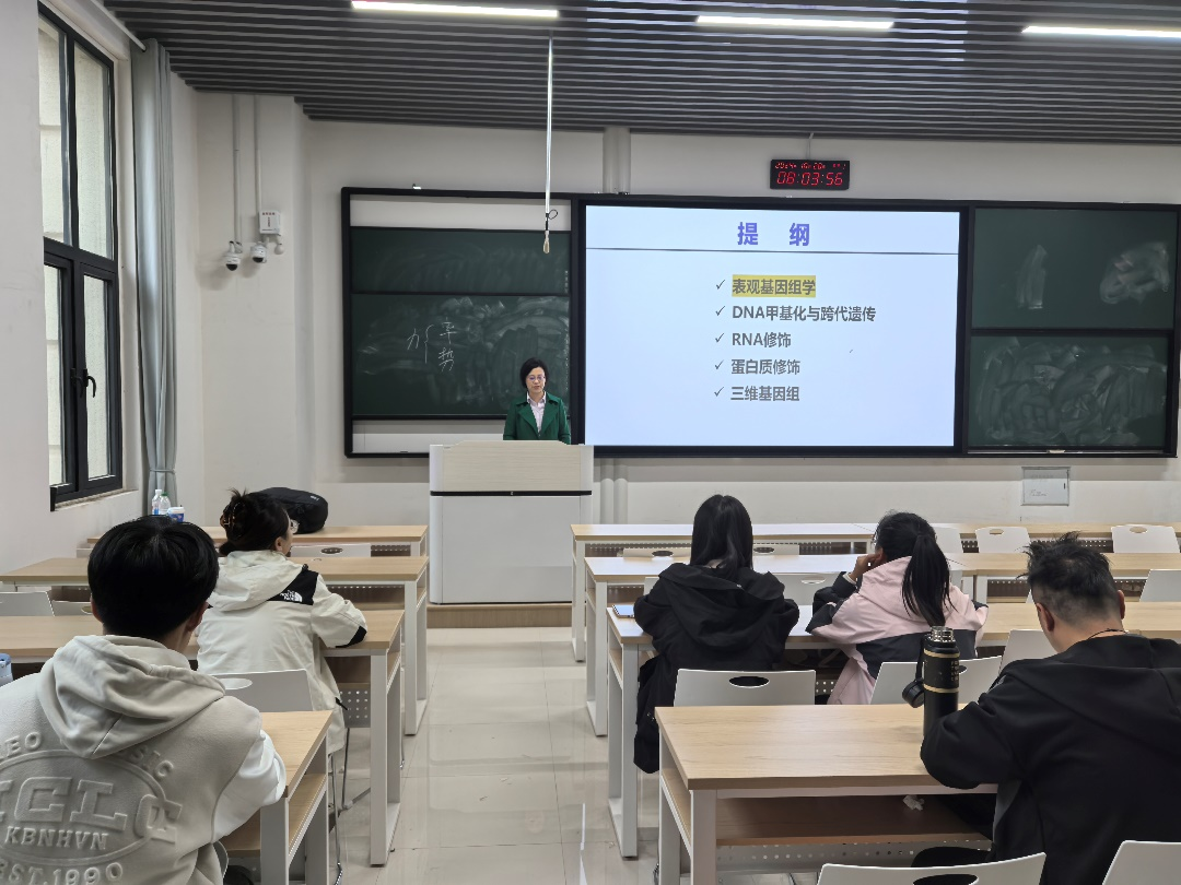 中国农业科学院北京畜牧兽医研究所王彦芳研究员以 “基因表达的表观遗传调控机制”为题,详细阐述了目前表观基因组学、DNA甲基化与跨代遗传、RNA修饰、蛋白质修饰以及三维基因组等前沿科学领域的最新研究进展,并提出一些目前研究中所面临的问题及未来面临的挑战。为在场师生提供了宝贵的学科知识和研究思路。此次报告不仅拓宽了我校师生的学术视野,也激发了大家对基因组学与遗传学研究的兴趣。